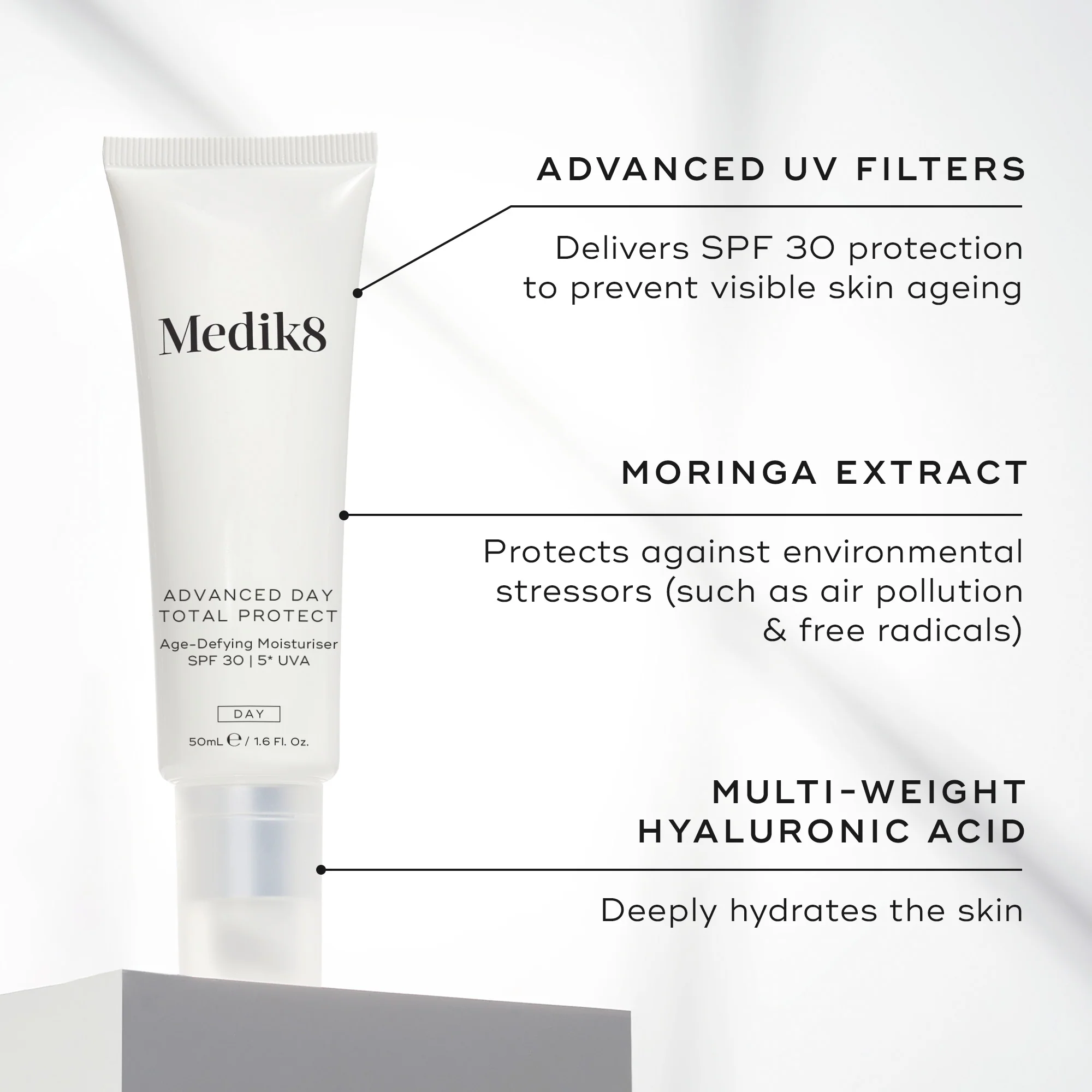 Hydrate, smooth and shield your skin from the damaging, ageing and burning effects of UV rays with Advanced Day Total Protect. This lightweight moisturiser and sunscreen in one delivers SPF 30 5* UVA protection as well as powerful defence against environmental aggressors including blue light, air pollution, infrared and glycation (damage to collagen and elastin within the skin).
