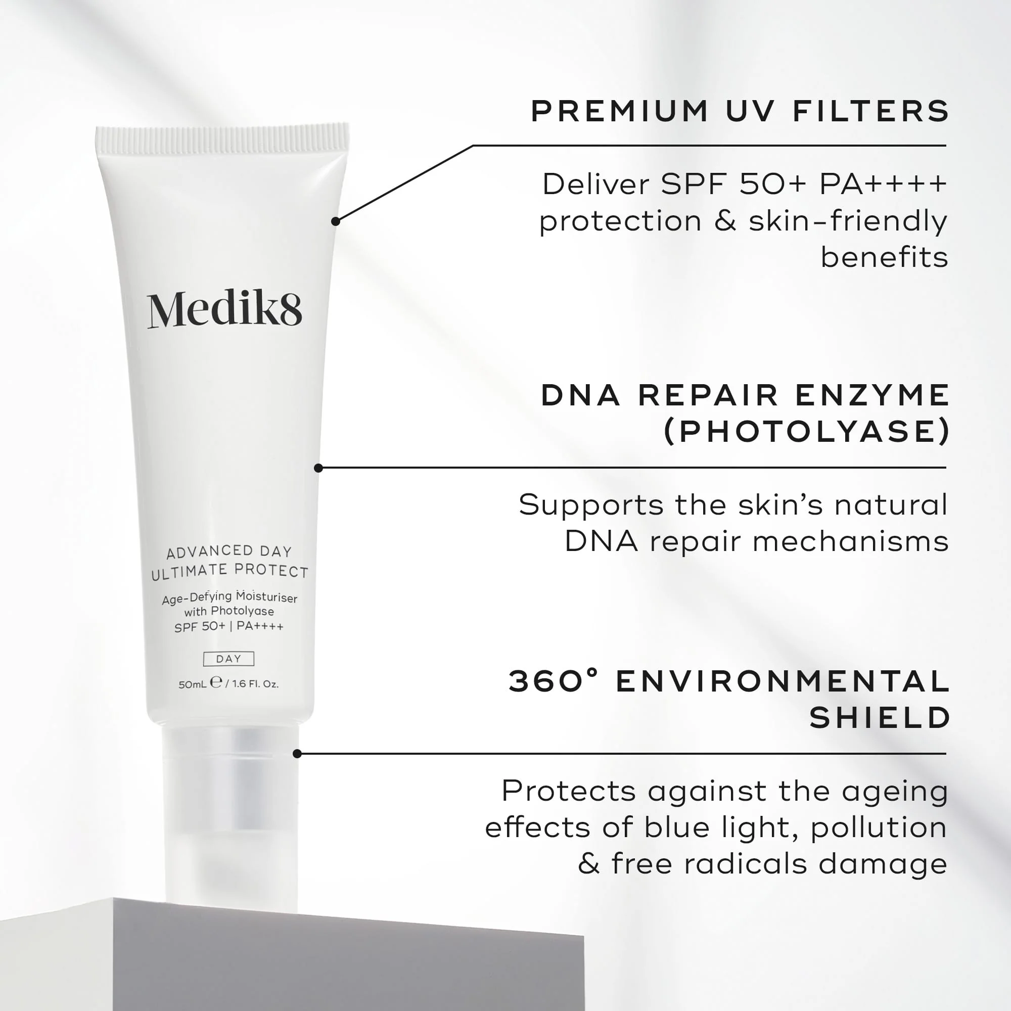 Protect your skin from UV rays, visibly reduce the look of fine lines and wrinkles and deeply hydrate the complexion - all at once. Advanced Day Ultimate Protect is your daily moisturiser and SPF 50+ PA++++ sunscreen in one. It offers a comprehensive environmental shield against the sun's damaging, ageing and burning effects as well as air pollution, blue light, infrared damage and glycation (damage to collagen and elastin within the skin). It therefore works to prevent the formation of wrinkles, dark spots, dullness and uneven skin texture.