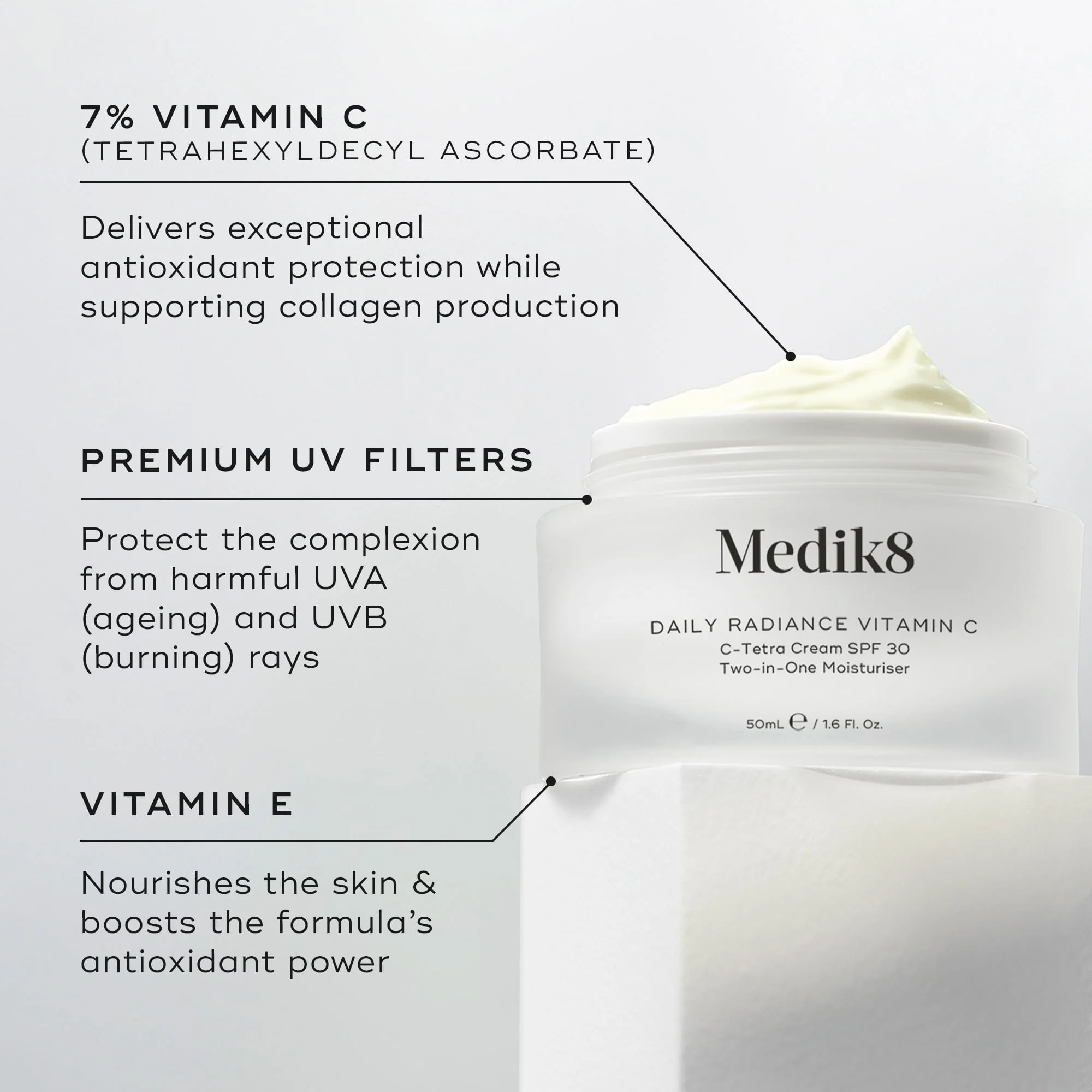 Visibly energise and protect your skin each morning with Daily Radiance Vitamin C, Medik8's bestselling 7% vitamin C + SPF 30 day cream.